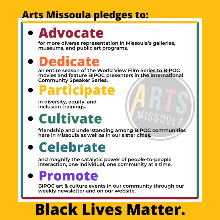 the increasing occurrences of bias, violence, and hate crimes toward Asian and Asian American individuals. In the wake of the Covid-19 pandemic, we are concerned with the real and devastating implications of hateful anti-Asian rhetoric in national and international discourse. We recognize that anti-Asian prejudice is one form of systematic racism. Arts Missoula affirms its commitment to be an anti-racist organization and working with allies toward a more just society.