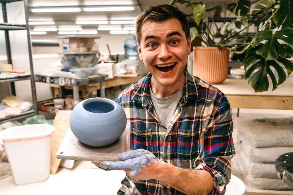 Andrew Avakian is a ceramicist whose focus is on creating unique and functional ceramic vessels inspired by architecture, historic vessels, and modern painting. His pieces are a harmony of pattern, color, and geometric abstraction that work together throughout all his works. This grant will allow him to acquire the final pieces of equipment that will bring him closer to maintaining an independent studio, and grow a sustainable career as an artist. Learn more on his website.
