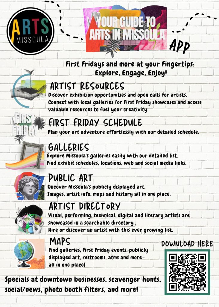 This app features artist resources, monthly First Friday schedules, galleries, public art, maps, a comprehensive artist directory, and more! Download it today and dive into Missoula’s vibrant arts scene!